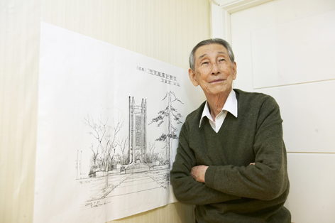 | ▲ 세종기념전각 설계도면 앞의 엄덕문 선생. ⓒ하지권 |