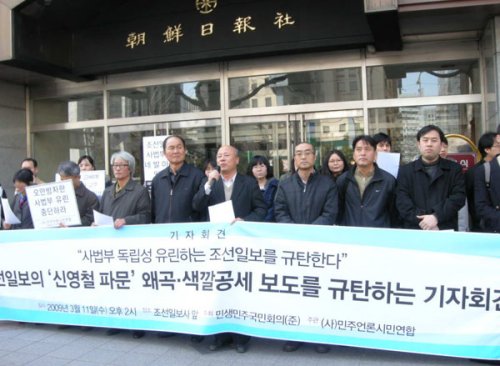 민생민주국민회의(준)과 민주언론시민연합 등 시민단체는 11일 서울 태평로 조선일보 사옥 앞에서 "조선일보의 '신영철 파문' 왜곡·색깔 공세 보도를 규탄하는 기자회견"을 열었다.