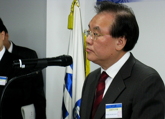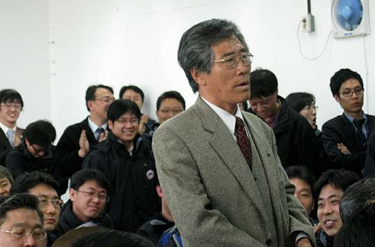 | ▲ 사퇴를 촉구하는 소액주주를 바라보고 있는 구본홍 사장. ⓒ프레시안 |
