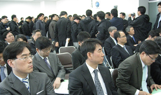 | ▲ 소액주주가 '세계적 망신거리"라며 구본홍 사장의 사퇴를 촉구하자 조합원들이 박수를 치며 환호하고 있다. ⓒ프레시안 |