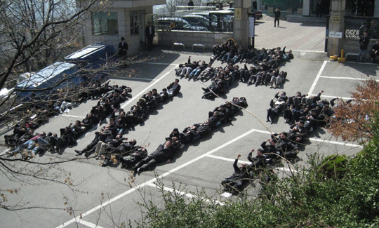 | ▲ YTN조합원들이 ' 구 OUT' ' 이란 글자를 만들고 있다. ⓒ프레시안 |