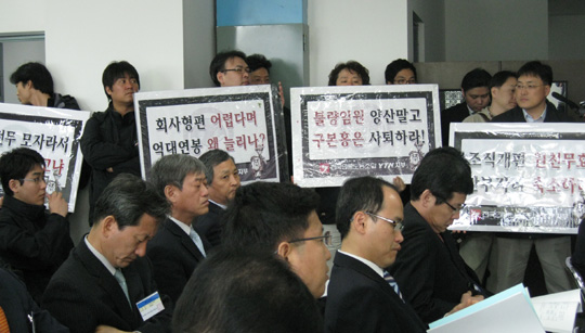 또 조합원들은 "비밀 집무실은 왜 만들었으며 그 공간을 놔두고 왜 2008년 7월부터 12월까지 호텔을 다니며 회사돈을 유용했느냐", "'비상경영'을 선포한 이후에도 회사 간부들과 호텔식당에서 기름진 음식과 술을 먹으며 회의해야 했느냐" 등을 따졌다. 이러한 질타에 씁쓸한 표정을 짓고 있던 구 사장은 "가끔 도시락도 시켜먹고 그랬다"는 다소 엉뚱한 대답을 했다.