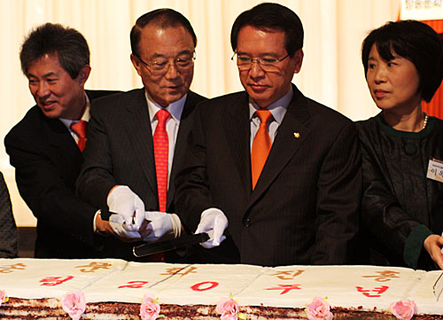 | ▲ 방송문화진흥회 20주년 기념식에서 엄기영 사장이 최시중 방송통신위원장과 함께 축하떡을 자르고 있다. ⓒ프레시안 |