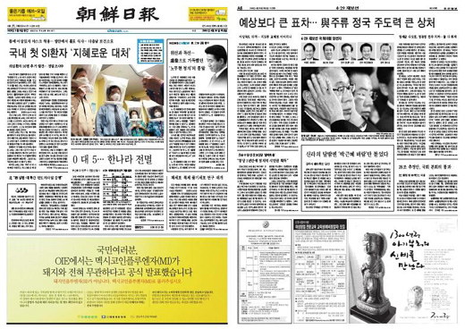 "국내 첫 돼지인플루엔자(SI) 감염 '추정환자'인 A씨가 감염이 확인되기까지 보인 지혜로운 처신을 두고 보건당국조차 놀라워하고 있다"는 내용이다. 그 옆에는 "위선과 독선… 허상(虛像)으로 가득했던 '노무현 정치'의 종말"이라는 제목으로 노무현 전 대통령이 30일 서울 서초동 대검찰청에 출두한다는 소식을 전했다.