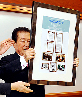 | ▲ 김대중 전 대통령이 21일 한국외대 학술회의에서 '빌리 브란트와 나. 동방정책과 햇볕정책'을 주제로 기조강연을 마치고 브란트 전 독일 총리와 찍은 사진과 편지 등이 담긴 액자 선물을 받고 번쩍 들어 보이고 있다. ⓒ뉴시스 |