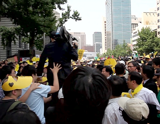 | ▲ KBS 카메라 기자가 항의하는 시민들 사이에서 곤욕을 치르고 있다. |