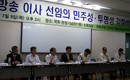 이날 토론회는 방송통신위원회(위원장 최시중)가 일방적으로 KBS, MBC, EBS 등 공영방송 임원 32명에 대한 선임 절차를 밀어붙이고 있는데 대한 비판이 높았다. 특히 방통위가 지난 3일부터 KBS와 방문진 이사 등에 대한 후보자 접수를 진행하면서도 최소한의 지원 자격이나 심사기준도 밝히지 않은데 대한 비판의 목소리가 컸다.