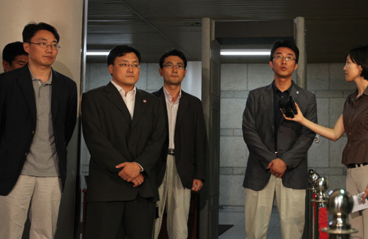 | ▲ 구본홍 사장에 대한 공동 폭행 등의 혐의로 검찰에 의해 고발된 노종면 위원장, 현덕수 전 위원장, 조승호 기자, 임장혁 기자 등이 재판 전에 언론 인터뷰에 응하고 있다. ⓒYTN 노조 |