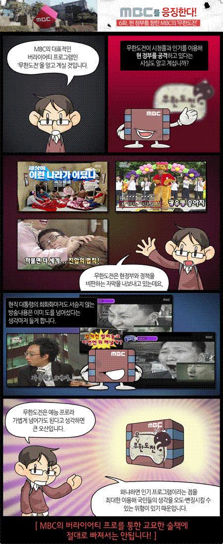 뉴라이트전국연합은 'Mr. 희망이와 함께하는 수요 연재 만화'라는 제목으로 자신의 홈페이지에서 연재하고 있는 만화에서 지난달 22일 "MBC를 응징하자-현 정부를 향한 MBC의 '무한도전'"이라는 제목으로 <무한도전>을 겨냥했다. 이 만화는 <무한도전> 제작진이 노홍철 씨가 송아지 인형 옷을 입고 노래 부르는 장면에 "광우병 송아지"라는 자막이 달린 것이나, "까불면 더 세게…진압의 법칙", "뇌 용량 1.9메가(바이트)…" 등의 자막을 단 것을 "현 정부 정책을 비판하는 자막을 내보내고 있다"고 문제삼았다.