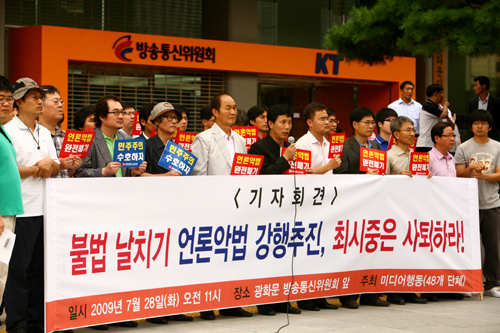 | "'구독률과 시청 점유율을 더한다? 절대 시행령 못 만들 것" 이날 방송통신위원회 앞에서도 최시중 위원장의 강행 방침을 비판하는 시민사회 기자회견이 열렸다. 이 자리에서 조준상 공공미디어연구소 소장은 "설사 용 빼는 재주가 있더라도 시행령은 만들지 못할 것"이라고 꼬집었다. 한나라당이 만든 '매체 합산 비율'을 시행령에 반영하는 것이 사실상 불가능하다는 지적이다. 조준상 소장은 "방통위는 10월 22일까지 시행령을 만들겠다고 하나 시행령을 만드는 것은 불가능하다"면서 "2분의 1과 3분의 1을 더하려면 분모를 6으로 통일해야 덧셈이 가능한데 방송법 개정안에는 '2분의 1 더하기 3분의 1은 5분의 2'라고 계산하는 내용이 있기 때문"이라고 말했다. 조 소장은 "한나라당은 구독률과 시청 점유율을 더하고, 그것이 30%를 넘지 않아야 한다는 것인데 시청 점유율은 분모가 TV의 총 시청 시간이고 구독률은 '가구'"라며 "덧셈을 할 수가 없다. 덧셈을 하려면 법을 바꿔서 시청율과 구독률을 더하거나 시청 점유율과 구독 점유율을 더하는 방식으로 가야 말이 된다"고 짚었다. 그는 "조·중·동 3개 신문의 발행부수와 유가부수를 따지면 실태가 고스란히 드러나기 때문에 '구독률'이라는 말도 안되는 기준을 만든 것이고 이를 시청 점유율에 더하기로 한 것"이라고 꼬집었다. 또 그는 "애초에 신문시장의 여론을 구독률이나 점유율로 재는 것은 적합하지 않다. 투표권은 개인에게 주지 가정에게 주는 것은 아니지 않느냐"고 지적하기도 했다. 미디어행동은 이날 기자회견문에서 "최시중 위원장의 발언은 헌법재판소를 압박하는 의도로 볼 수밖에 없고 야당 추천위원의 반대에도 개인의 입장을 기자회견에서 낸 것은 합의제 기구의 본질을 무시한 독선적 행위"라며 최시중 위원장의 사퇴를 촉구했다.