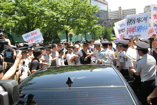 ▲ MBC 조합원들이 김우룡 이사장의 차를 둘러싸고 사퇴를 촉구하며 경찰들과 몸싸움을 벌이고 있다. ⓒ프레시안