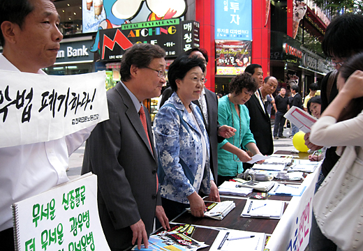 이날 서명 운동에는 신태섭 전 KBS 이사도 동참해 시민들에게 유인물을 나눠줬다. 신 전 이사는 "언론 관련법은 그 자체로 원천 무효다. 방송을 재벌과 신문 등 힘있는 세력에게 열어주고 이윤을 추구하게 하는 내용 그 자체가 헌법 정신과 맞지 않고, 국민 다수의 의견을 무시한 의회의 폭거이며 '재투표', '대리투표' 논란으로 절차적 정당성도 없다"고 지적했다.