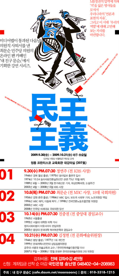 정연주 전 사장은 오는 30일, 최문순 의원은 10월 8일, 진중권 전 교수는 10월 14일, 김정헌 전 문화예술위원장은 10월 21일에 강연을 맡는다. 장소는 서울 정동 프란치스코 교육회관 대강의실(207호)이다. 주최 측은 "일반인, 특히 젊은 대학생들을 대상으로 한 민주주의 특강이 될 것"이라고 설명했다.