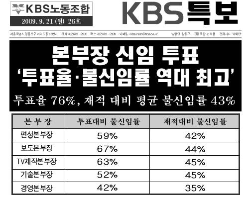 이에 KBS노조는 "지난해 이병순 사장 취임 이후 임명된 이들 본부장들의 조직 운영 능력과 공영방송 실천 의지가 구성원들로부터 낙제점을 받은 것"이라며 "이들 본부장을 지휘, 통솔하는 이병순 사장도 투표 결과로부터 자유로울 수 없다"고 지적했다.