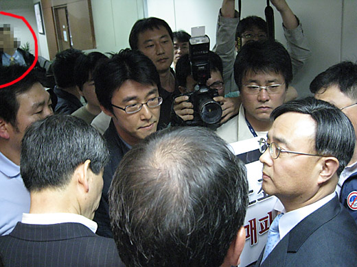 | ▲ 5월 19일 당시 프레시안 촬영 사진. YTN 노조가 촬영자로 추정하고 있는 간부가 인사위원들에게 항의하고 있는 YTN 조합원들을 지켜보고 있다. 그가 착용하고 있는 넥타이도 동영상에 나온 것과 비슷한 것으로 보인다. ⓒ프레시안 |