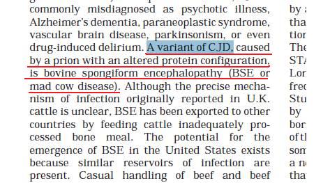 (1996년 vCJD가 처음으로 발견됐다. CJD와 비슷하지만, 명백한 차이점들이 있다. vCJD는 평균 사망자의 나이가 30세 이하로 젊은이들에게 영향을 미치고 ('CJD'보다) 상대적으로 병을 앓는 기간이 더 긴 것으로 나타났다. 게다가 다른 인간 TSEs(전염성 해면상뇌증)이 음식 노출과는 연관되지 않는 반면 vCJD는 음식을 통한 광우병(BSE)에 노출(된 것과) 밀접한 관련이 있다. vCJD의 감염 경로는 아직까지 정확하게 밝혀지지 않았으나 그것은 보통 광우병에 오염된 음식을 통해 전염되는 것으로 알려졌다.)