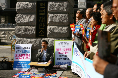 그는 "국민은 이명박 정권의 날치기 대리투표를 무효화시키라고 헌법재판소에 권한을 부여했다"면서 "헌법재판소가 이 권한을 내팽개친다면 헌정 질서가 제대로 작동하지 않는 것으로 국민들은 이 정권과 헌법재판소에 대한 저항에 나설 수밖에 없을 것"이라고 말했다.