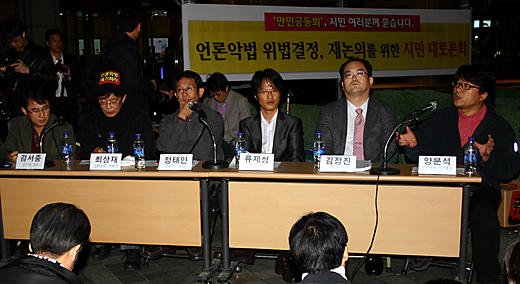 6일 서울 중국 프레스센터 앞마당에서는 '언론 악법 위법 결정, 국회 재논의를 위한 만민공동회'가 열렸다. 언론학자, 변호사, 경제전문가, 언론인, 일반 시민 등이 참여한 이날 토론회에서는 헌법재판소 판결과 미디어법에 대한 향후 대응 방안부터 시작해 한국 민주주의의 현재에 대한 성찰까지 폭넓은 논의가 이뤄졌다.