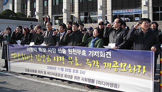 이들은 "김인규 후보는 이사회의 표결 절차를 밟았지만 공개적이고 민주적인 절차를 밟은 것은 아니다"라며 "이명박 대통령은 김 씨의 임명을 거부하고 이사회도 사장 재공모에 착수해야 한다"고 촉구했다.