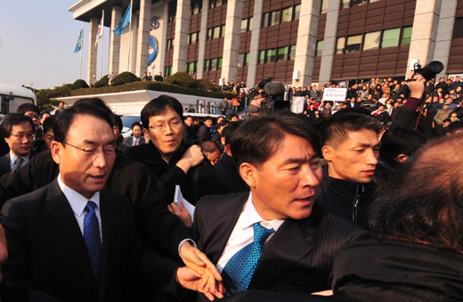 김인규 "함께 나가자" 선창에 "MB 특보 물러가라" 구호