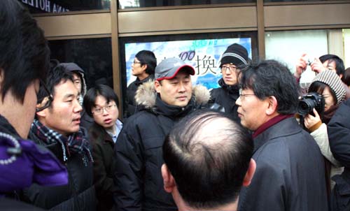 | ▲ 엄기영 사장이 이근행 MBC 노조 위원장의 질책에 답하고 있다. ⓒMBC 노동조합 |