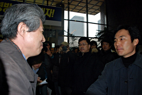| ▲ 엄기영 MBC 전 사장이 지난 8일 '마지막 퇴근'에 앞서 이근행 노조위원장이 악수를 나누고 있다. ⓒPD저널 |