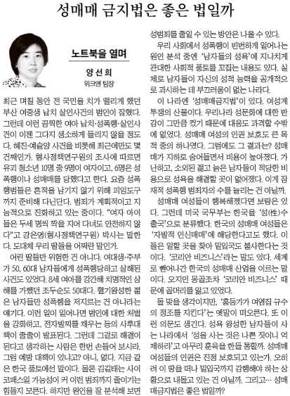 | ▲ 지난 12일 <중앙일보>에 실린 양선희 위크엔 팀장의 칼럼 "성매매 금지법은 좋은 법일까". ⓒ중앙일보 |