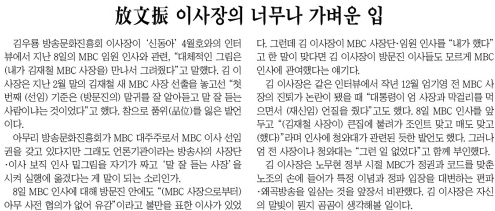이 신문은 김 이사장의 발언을 두고 "참으로 품위를 잃은 발언"이라며 "아무리 방송문화진흥회가 MBC 대주주로서 MBC 이사 선임권을 갖고 있다지만 그래도 언론 기관이라는 방송사의 사장단·이사 보직 인사 밑그림을 자기가 짜고 '말 잘 듣는 사장'을 시켜 실행에 옮겼다는 게 말이 되는 소리인가"라고 비난했다.