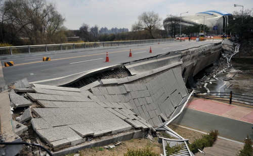 | ▲ 4일 오후 12시 20분께 서울 올림픽공원 청룡다리 한쪽 인도 전체가 붕괴되는 사고가 일어났다. ⓒ뉴시스 |