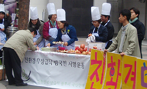 이들은 이날 서명 운동과 함께 iCOOP 생협연합회에서 제공한 친환경 사과와 전국여성농민회총연합(전여농)에서 제공한 토종 상추씨도 나눠줬다. 서명을 받던 한 시민운동가는 "우리도 친환경 농산물을 맛보고 아이들에게도 우리 땅에서 난 친환경 농산물을 먹이자"라고 말했다.
