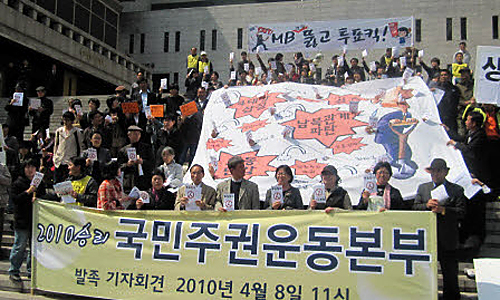 | ▲ '2010 승리 국민주권운동본부'가 8일 서울 광화문 세종문화회관 앞에서 발족 기자회견을 열고 있다. 이들은 '남북관계 파탄', '4대강 삽질' 등의 글귀가 적힌 현수막을 '투표 참여'라는 종이를 든 손으로 찢는 퍼포먼스를 벌였다. ⓒ국민주권운동본부 |