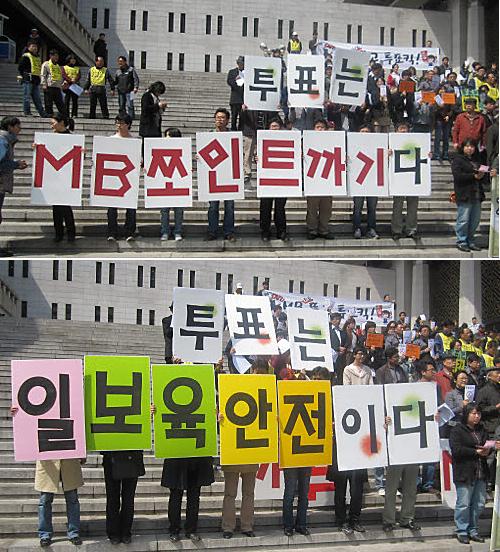 이날 국민주권운동본부 참여단체들은 각기 "투표는 일자리다", "투표는 쌀값이다", "투표는 빈민 생존권이다", "투표는 MB 조인트 까기다", "투표는 보육안전이다", "투표는 등록금 인하다" 등의 구호를 들고 나와 눈길을 끌었다.