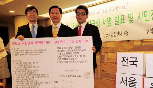 한명숙 서울시장 후보, 유시민 경기도지사 후보 등 수도권 광역단체장 후보와 곽노현 서울시 교육감 후보, 김상곤 경기도 교육감 후보 등 수도권 교육감 후보들이 '친환경 무상 급식' 정책 협약을 맺었다. 6·2 지방선거를 앞두고 야당 후보들이 '친환경 무상 급식' 정책에 공동 보조를 맞춘 것.