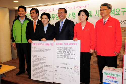 친환경무상급식연대는 17일 서울 적선동 건강연대 3층에서 서울시장 선거에 출마한 한명숙 민주당 후보, 노회찬 진보신당 후보와 경기도지사 선거에 출마한 유시민 국민참여당 후보와 심상정 진보신당 후보, 인천시장에 출마한 송영길 민주당 후보와 김상하 진보신당 후보에게 '친환경 무상 급식 실현을 위한 시민 정책 요구안'을 전달했다.