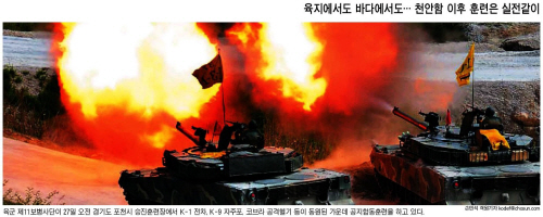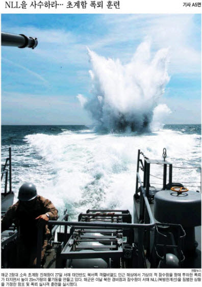 <조선일보>는 1면에 진해함이 폭뢰를 투하해 20m가량의 물기둥이 솟아오르는 사진을 1면에 배치했고 3면에는 붉은 화염이 치솟는 육군 제11보병사단이 경기도 포천시 송진훈련장에서 벌인 공지합동훈련 사진을 내놨다. <동아일보>도 1면에"'북 도발 더는 용서없다' 해군, 서해 기동훈련"이라는 제목과 함께 역시 폭뢰 투하 사진을 1면 톱 자리에 배치했다.