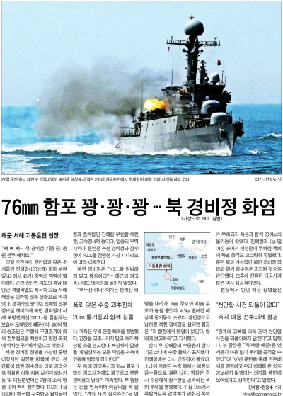 <중앙일보>도 8면에서 "76mm 함포 꽝·꽝·꽝…북 경비정 화염"이라는 재목으로 실제 전쟁 상황인 듯한 르포 기사를 냈다. 이 신문은 "북한 경비정의 남하가 계속됐다. 부 함장은 눈을 번득이며 어금니를 꽉 물었다. '격파 사격 실시하라'는 명령을 내리자 76mm주포와 40mm 부포가 불을 뿜었다"고 썼다.
