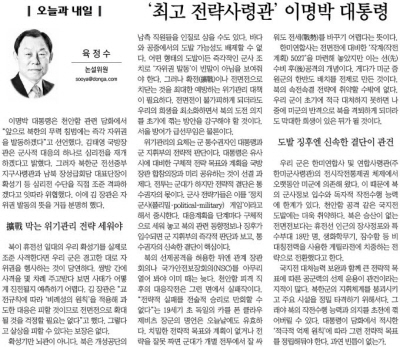 <동아일보>는 이날 "'최고 전략사령관' 이명박 대통령"이라는 제목으로 '전면전'까지 가정하는 내용의 칼럼을 냈다. 육정수 논설위원이 쓴 이 칼럼에서 <동아일보>는 "전면전이 불가피하게 되더라도 우리의 희생을 최소화하면서 북의 도전 의지를 초기에 꺾는 방안을 강구해야 할 것"이라며 "서울 방어가 급선무임은 물론이다"라고 주장했다.