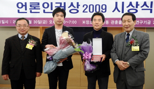 | ▲ 지난해 1월 언론인권상 본상을 수상한 이근행 위원장과 오행운 <PD수첩> PD. 이들은 2008년 10월 7일 방송된 <PD수첩> '내가 정말 죄를 지었나요?'편(2008년 10월 7일 방송)으로 언론인권상을 받았다. ⓒ뉴시스 |