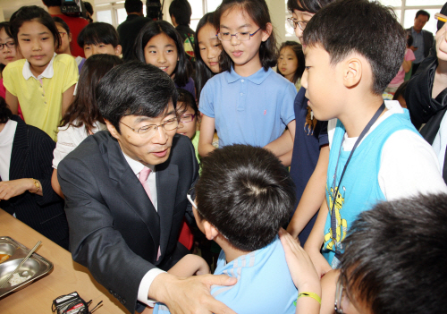 21일 서울 강남구 수서동 대왕초등학교 점심시간. '무상급식 시행 관련 학교 현장 의견 수렴' 차 이곳에 들른 곽노현 서울시교육감 당선자는 감탄사를 멈추지 못했다. 학교 식당에서 곽 당선자는 초등학교 아이들의 '깜짝 청원'에 맞닥뜨렸다.