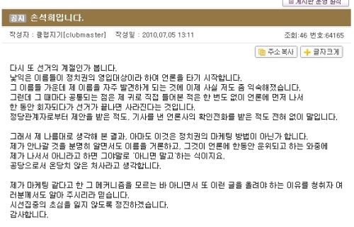 손 교수는 "그런데 그 때마다 공통되는 점은 제 귀로 직접 들어본 적은 한 번도 없이 언론에 먼저 나서 한 동안 회자되다가 선거가 끝나면 사라진다는 것"이라며 "정당관계자로부터 제안을 받은 적도, 기사를 낸 언론사의 확인전화를 받은 적도 전혀 없이 말이다"라고 했다.