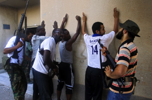 | ▲ 리비아 수도 트리폴리의 아부 살림 지역에서 반군으 교전 중 붙잡은 카다피군 병사들의 몸을 수색하고 있다. ⓒAP=연합뉴스 |