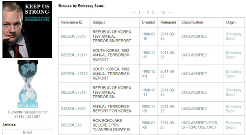 | ▲ 위키리크스는 25일(현지시간) 주한 미대사관 작성의 외교전문 886건을 새로이 공개했다. ⓒ위키리크스 홈페이지 화면캡쳐 |