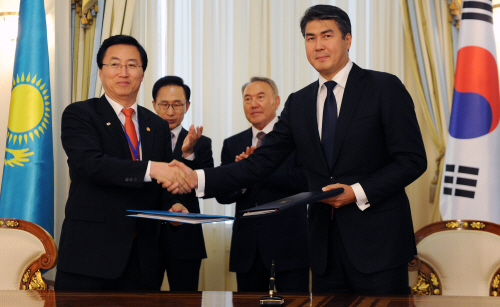 | ▲ 이명박 대통령과 나자르바예프 카자흐스탄 대통령이 지켜보는 가운데 25일 오후 아스타나 대통령궁에서 열린 한-카자흐 발하쉬 석탄화력발전소 협정식에서 최중경 지경부장관과 이세 케세프 카자흐 산업신기술부장관이 악수하고 있다. 그러나 위키리크스가 공개한 미 외교전문에 따르면, 한국의 발하쉬 발전소 수주는 이미 2년 전 결정된 것으로 알려졌다. ⓒ연합뉴스 |