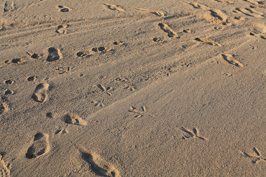 | ▲ 행사 참가자들의 맨발자국과 야생동물들의 발자국이 겹쳐진 모래밭. ⓒ프레시안(최형락) |