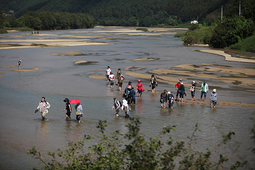 | ▲ 지난 24일 <프레시안> 창간 10주년 맞이 내성천 답사 행사 참가자들이 맨발로 강을 건너고 있다. ⓒ프레시안(최형락) |
