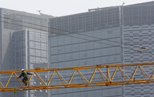 | ▲ 중국 베이징의 건설현장에서 한 노동자가 크레인 위를 걸어가고 있다. '위태로운 중국 경제'를 상징하는 모습이라고 <로이터>가 전하고 있다. ⓒ로이터=뉴시스 |