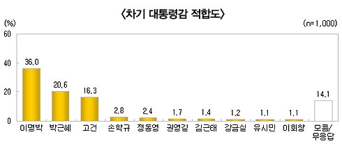 한편 차기 대통령감으로 가장 적합한 인물을 물어본 결과 이명박 전 서울시장이 36.0%로 1위를 달렸다. 박근혜 전 한나라당 대표가 20.6%로 2위, 고건 전 총리가 16.3%로 3위를 기록했다. 손학규 전 경기도지사 2.8%, 정동영 전 열린우리당 의장 2.4%, 권영길 민주노동당 의원 1.7%, 김근태 열린우리당 의장 1.4% 순이었다.