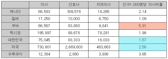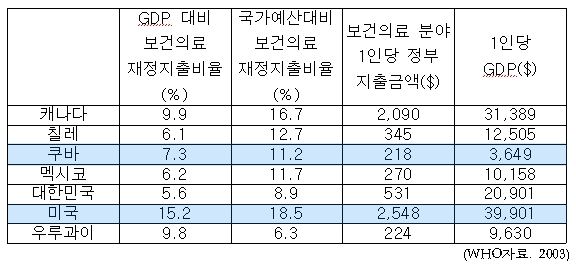 어려운 국가 상황에서도 약자에 대한 보호는 중요한 가치로 여겨지기 때문이다. 우리나라에서도 무상의료에 대한 다양한 실현방안이 모색되고 있다. 하지만, 여전히 대부분의 사람들은 실현 가능성을 낮게 본다. '무상의료가 되기야 하면 좋지만, 이렇게 경제도 어려운데, 너무 이상적이지.'라고 말하는 사람들이 많다. 1인당 국내총생산(GDP)이 한국의 6분의 1이고, 1인당 보건의료 지출비가 우리의 절반인 쿠바도 하는 일을 우리는 못하고 있다.(아래표 참조)