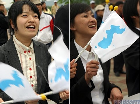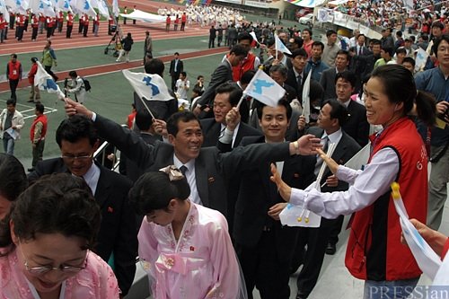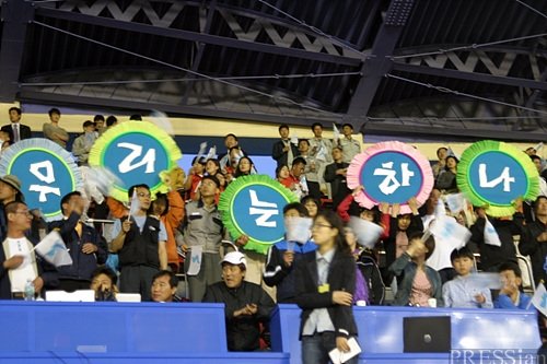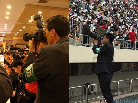 이번 대회에 참가한 북측 대표단에는 총 7명의 기자단이 포함돼 있다. 이들은 왼팔에 '기자'라는 글자 사이로 단일기가 그려진 완장을 차고 행사장 곳곳을 뛰어다녔다.