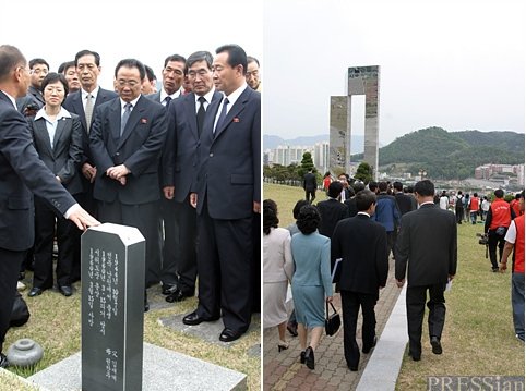 북측 대표단은 나흘 동안 두 번에 걸쳐 남측 선혈들이 묻힌 묘역을 방문했다. 4월 30일 오전에는 이승만 정권의 부정선거에 항거하다 목숨을 잃은 이들이 안장된 마산 3.15 국립묘지를, 노동절인 1일 당일에는 아침 일찍 김주익, 배달호 등 한반도 남쪽의 노동자들이 묻힌 경남 양산의 솥발산 노동열사 묘역을 찾았다.